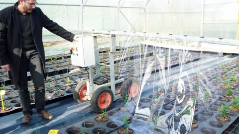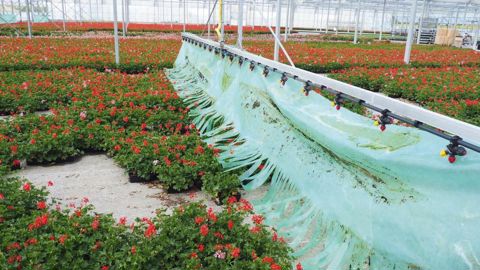 Dispositif de stimulation mécanique sur culture de pélargonium installé en entreprise. PHOTO : PHILIPPE MOREL