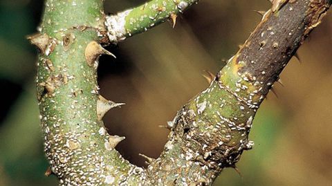 La cochenille diaspine du rosier ou cochenille à bouclier du rosier (Aulacaspis rosae) est un insecte parasite de l'ordre des hémiptères, du sous-ordre des homoptères et de la famille des Diaspididae. Cette espèce subtropicale est indigène de Nouvelle-Calédonie. Comme beaucoup de cochenilles diaspines, elle a été introduite en France métropolitaine à la faveur d'échanges commerciaux. Aulacaspis rosae connaît aujourd'hui une distribution mondiale. Elle est recensée en Europe, en Asie, en Afrique, en Amérique du Sud et centrale, aux États-Unis, au Canada et en Océanie. Les infestations de rosiers surviennent le plus souvent en situation abritée. On peut également détecter ce ravageur sur les tiges de ronce (Rubus fruticosa), de framboisier (Rubus idaeus) ou de groseillier (Ribes grossularia), occasionnellement sur les feuilles. Les rosiers sauvages (églantiers) sont plus sensibles que les hybrides et les Rubus cultivés sous abri sont davantage exposés aux attaques. En cas de pullulation, des tiges dépérissent et les sujets atteints peuvent même mourir. La cochenille du rosier présente un profond dimorphisme sexuel. Le bouclier de la femelle adulte est assez résistant, presque aplati, subcirculaire, de dimension plus importante que celui du mâle. Il est formé par la superposition des exuvies larvaires jaune brunâtre et nymphales. Le bouclier mâle est de forme allongée en bâtonnet ou elliptique. Son corps tricaréné est blanc. Chez les cochenilles diaspines, les organes sensoriels (antennes, yeux) sont atrophiés, lorsqu'ils ne sont pas absents. L'appareil buccal, de type piqueur, est formé par un long stylet. Ce rostre souple et fin permet à l'insecte d'aspirer la sève à l'aide d'une pompe animée par de puissants muscles. Au repos, cet organe est enroulé dans une poche ventrale appelée crumena. La salive injectée dans les tissus de la plante au moment des prélèvements alimentaires contient des substances toxiques qui provoquent des déformations et des nécroses de tissus. Les derniers segments du crumera forment le pygidium. Celui-ci porte à son extrémité des sortes de peignes dont l'examen microscopique permet la détermination spécifique. Outre ce critère de reconnaissance morphologique, on distingue au laboratoire la vulve, l'anus, ainsi que plusieurs grandes cirières qui sécrètent la cire nécessaire à la constitution du bouclier.