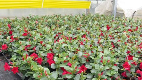 Sur Dipladenia Sundaville® Red en pots, entre 1 à 5 allers-retours par jour, la stimulation mécanique n'influe pas beaucoup sur la hauteur (- 10 % par rapport au témoin), mais très positivement en provoquant une meilleure ramification et un port plus fourni. Par ailleurs, la présence des lianes est nettement moins importante en nombre (- 60 % par rapport au témoin) et en longueur. L'effet seuil reste à trouver, avec des essais allant de 12 jusqu'à 48 passages par jour (Dephy Expe Hortipot). La culture semble réagir davantage si les stimulations sont réalisées le matin ; elles sont plus efficaces en jour court.