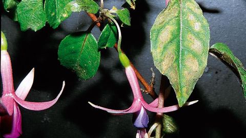 Dégâts d'aleurodes : le fuchsia infesté ralentit sa croissance et accuse des taches foliaires avant de flétrir. Les fleurs avortent ou fanent. PHOTO : JÉRÔME JULLIEN