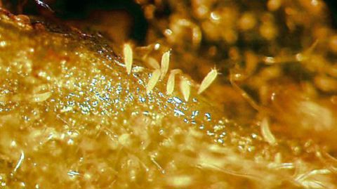 Aculops fuchsiae à l'intérieur d'une galle. Ce ravageur microscopique, jaunâtre et fusiforme, est inféodé au fuchsia. PHOTO : SRPV BRETAGNE