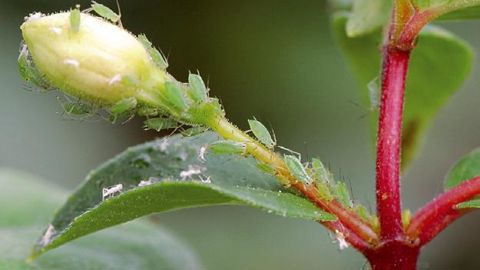 Colonie de pucerons sur fuchsia. Les exuvies, le miellat, puis la fumagine, salissent les tissus. PHOTO : JÉRÔME JULLIEN
