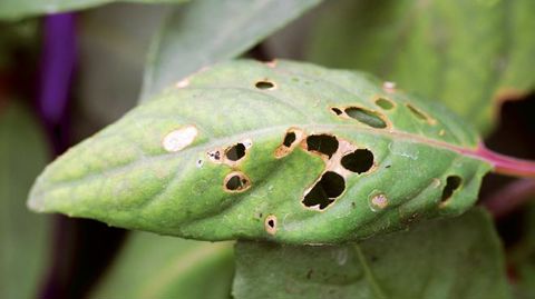 Dégâts d'altise sur fuchsia. Les feuilles sont dentelées et criblées de trous. Les pétales de fleurs peuvent être rongés. PHOTO : JÉRÔME JULLIEN