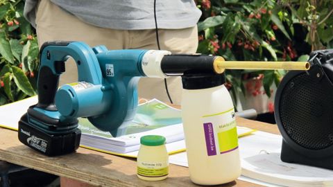 Le pollen s'applique au moyen d'un souffleur Makita équipé de l'embout Nutri-App ou d'une poudreuse manuelle. Le complément alimentaire favorise le développement des acariens prédateurs en l'absence de pression des ravageurs.