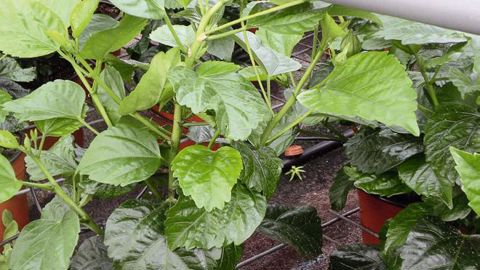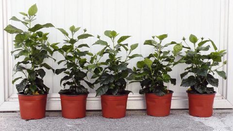 Hauteur des hibiscus après trois mois de stimulation. De gauche à droite : la plante témoin, puis stimulée une fois par semaine, deux fois par semaine, trois fois par semaine et quatre fois par semaine. PHOTO : ÉMILIE LERAY