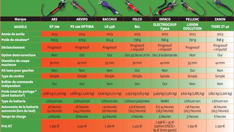 Voici un tableau récapitulatif des caractéristiques des sécateurs testés (ci-dessus), une synthèse pour chaque outil, les résultats des tests comparatifs ainsi que l'avis de la rédaction de La Vigne. Objectif : que chacun trouve un sécateur à sa main. Ce compte rendu souligne les efforts déployés par les marques, dont les harnais sont de plus en plus confortables et les batteries de plus en plus légères. Il salue l'arrivée d'Ars, un outsider, le seul à avoir les qualités pour prétendre bousculer un marché dominé par le trio Infaco, Pellenc et Felco. Ces trois marques bénéficient de puissants réseaux de distribution. Leurs sécateurs sont appréciés pour leur légèreté, leur maniabilité et leur réactivité. Mais ils sont encore perfectibles !