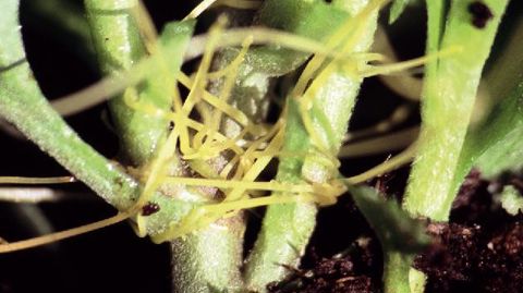 Les filaments jaunâtres ou verdâtres de la cuscute s'enlacent autour du collet et puisent la sève élaborée dans les vaisseaux conducteurs au moyen de suçoirs. PHOTO : JÉRÔME JULLIEN