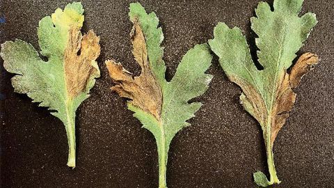 Attaque de nématodes des feuilles sur chrysanthème. PHOTO : SRPV PAYS DE LA LOIRE