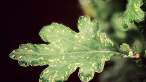La rouille blanche du chrysanthème Puccinia horiana est soumise à une lutte obligatoire chez les producteurs de jeunes plants. PHOTO : JÉRÔME JULLIEN