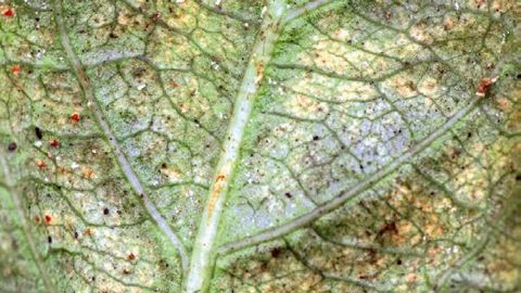 Attaque d'acariens tétranyques tisserands (formes estivales) face inférieure d'une feuille. PHOTO : JÉRÔME JULLIEN