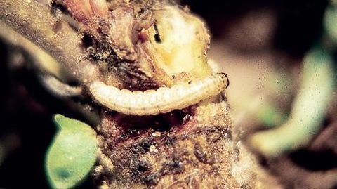 Chenille et morsures de pyrale sur tige de chrysanthème. PHOTO : JÉRÔME JULLIEN