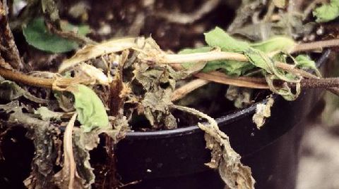 En conditions d'humidité élevée, la pourriture brune du collet et des racines (Phytophthora cryptogea) provoque un rougissement du feuillage et un blocage de croissance. Très voisine, la pourriture des racines ou fonte des boutures (Pythium sp.) entraîne une rupture du flux de sève. Puis les tissus infectés se désagrègent. La sclérotiniose (Sclerotinia sclerotiorum) génère une pourriture blanche humide au collet, tandis que les feuilles flétrissent. Autre champignon stérile, le rhizoctone brun (Rhizoctonia solani) provoque une nécrose sèche, à l'origine d'un jaunissement du feuillage. Les boutures atteintes ont peu ou pas de racines. Un dépérissement rapide peut également provenir de la verticilliose (Verticillium sp.). Ce champignon contamine les racines, puis migre vers les tissus vasculaires. La fusariose vasculaire du chrysanthème (Fusarium oxysporum f. sp. chrysanthemi) agit sensiblement de même. La galle bactérienne du collet et des racines ou crown-gall (Agrobacterium tumefaciens) est peu fréquente. Elle cause un stress physiologique, parfois dès le stade bouture. Les ravageurs telluriques les plus insidieux sont des nématodes : le nématode des lésions racinaires (Pratylenchus penetrans), dont les piqûres nécrosent les tissus, et le nématode des tiges et des bulbes (Ditylenchus dipsaci), qui cause des déformations et des taches sur les tiges et feuilles. Enfin, rare mais préoccupante, la cuscute (Cuscuta sp.) est une plante annuelle parasite, capable d'affaiblir le chrysanthème et de transmettre le viroïde du rabougrissement (CSVd).