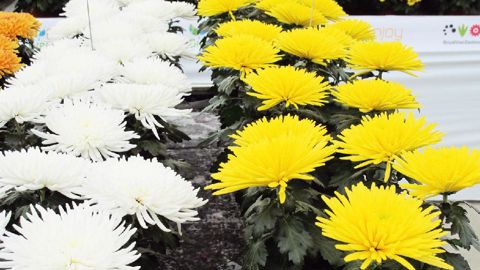 Ils n'arrivent que difficilement à s'affranchir de l'image de plante de Toussaint. Peut-être le consommateur en a-t-il trop vu tout au long de l'année, d'où une lassitude, notamment avec les cultures programmées par photopériodisme qui ont inondé le marché à tout moment depuis plusieurs dizaines d'années. La palette de couleurs, les fantaisies et bicolores (en augmentation continue à partir de mi-juillet), la diversité des formes de fleurs (anémone, spatulée, tubulée, spider...) ne suffisent pas entièrement à relancer les ventes. Même les types « rucher » vert et blanc, pourtant très à la mode il y a peu, sont concernés. Pour autant, Royal Van Zanten ne baisse pas les bras, surtout pour cette plante qui constitue toujours un produit horticole majeur. Il expérimente de nouveaux types ou des tons en contraste et nuancés entre le coeur et les pointes des pétales. Il met aussi en avant cette saison des types à fleur plate sur le dessus et au port bien en boule... spécialement conçus pour la décoration. Par exemple, Chrysanthemum Organza® se cultive comme n'importe quel chrysanthème dirigé, mais il sera plutôt utilisé en décoration, depuis les fêtes de printemps jusqu'à fin septembre. Il était proposé aux Flower Trials® pour décorer une salle de mariage ! Dave Geerlings, sélectionneur pour Royal Van Zanten Breeding, explique : « Le marché attend des plantes fortes, des coloris vifs, des formes de fleurs variées. Nous essayons de sélectionner des végétaux dont l'apparence se distingue du chrysanthème classique pour le consommateur. Pour le producteur, la plupart du temps, rien ne change en termes de culture. » Autre gamme variétale en développement : Chrysanthemum Skyfall®, intéressant à produire directement en suspension. Cette série est proposée depuis l'an passé, avec cinq coloris disponibles. Ces derniers ont été testés avant et choisis pour leur croissance et leur développement homogènes quand ils poussent ensembles dans le même contenant.