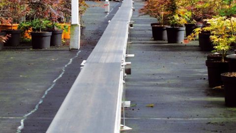 La totalité de la production est conduite sur un sol de culture sur pouzzolane. Une couche de 10 cm de roche poreuse assure un drainage vertical et une première filtration de l'eau d'irrigation (1). Dans la nouvelle serre, la société néerlandaise Erfgoed a aménagé ce même type de sol sur environ un hectare. Nouveauté par rapport aux parcelles extérieures : une nappe d'irrigation, Florimat 3 (distribuée par Flowering Plants Ltd, Royaume-Uni), est placée sous la toile hors-sol (2). Elle se compose de fibres hydrophiles capables de retenir l'eau et d'en assurer la diffusion homogène. « Elle permet un bon développement racinaire », assure Arjan Bos, satisfait. Florimat est installée uniquement dans la serre. « À l'extérieur, les détritus satureraient la nappe. » Le sol a été divisé en plusieurs sections indépendantes de façon à pouvoir ajuster la dose d'irrigation aux différents genres et tailles cultivés dans la serre.