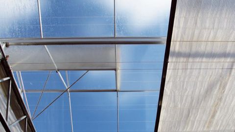 La nouvelle serre Venlo de 1,15 ha, de 4,20 m de hauteur sous chéneau, est équipée d'un verre spécial. Développé pour l'industrie solaire, produit en Inde et en Chine, le verre Vetrasol 503 transmet plus de 91 % de la lumière et la diffuse, réduisant ainsi les risques de brûlure du feuillage. Il a également subi un traitement pour la sécurité. « C'est un verre sécurit (« safety glass ») : quand il casse, cela produit de tout petits fragments qui ne sont pas coupants », explique un représentant de Prins Group, l'entreprise qui a installé la serre. « On peut marcher dessus. Elle a été construite de façon à supporter 60 kg/m2 (en cas de fortes chutes de neige). » Autre atout avancé du matériau : il laisse passer 68 % des UVB. Du fait de cette caractéristique, « il permet d'obtenir des plantes plus colorées que sous une serre en plastique », affirme Arjan Bos. Un bémol toutefois : la surface extérieure, rugueuse, peut rendre son entretien difficile sans machines spécifiques susceptibles de nettoyer la toiture. Ce verre coûte environ trois fois plus cher qu'un modèle standard. L'investissement total (sol de culture sur lave et serre) a été de 1,3 million d'euros. « Je veux de la qualité durable. Je sais que c'est l'avenir et il s'agit d'une grande avancée pour nous. Ce verre offre les avantages du plastique sans ses inconvénients (dégradation par les UV) ; et il n'a pas besoin d'être blanchi. » Les panneaux latéraux de la serre sont translucides pour assurer une croissance uniforme de la culture. La toiture est équipée d'écrans XLS 50 Harmony Revolux, produits par la société Ludvig Svensson. Ils réfléchissent la lumière le jour et conservent la chaleur la nuit.