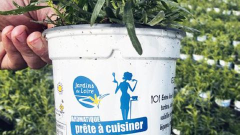 Les pots de 1 litre sont imprimés : « Aromatique prête à cuisiner », marque Jardins de Loire, conseils d'entretien et astuces culinaires.