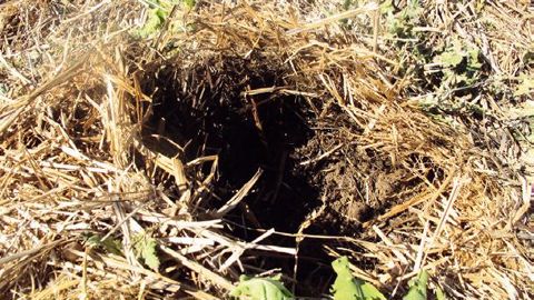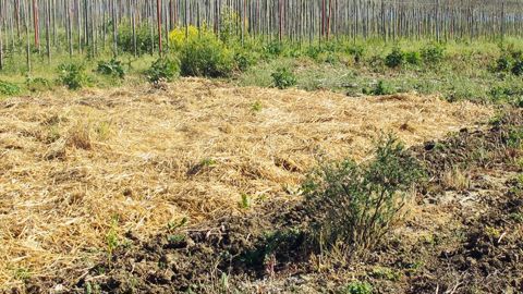 Les essais réalisés sur le terrain et encadrés par l'Arexhor Pays de la Loire permettent d'expérimenter de nouvelles techniques. Ici, protection du sol par de la paille et potentille pour attirer les auxiliaires, chez Alain Pichot. En vignette : la paille retient l'humidité. PHOTOS : VALÉRIE VIDRIL