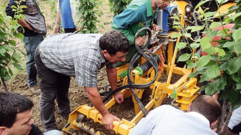 La démonstration du 11 juin, à Ambillou-Château, a permis aux producteurs du douessin et d'ailleurs d'échanger sur leurs besoins en amélioration de matériels. Ici, présentation d'une bineuse intercep sur fruitiers. PHOTO : CHAMBRE D'AGRICULTURE 49