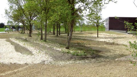 Lorsque Charles Dard interroge Pierre Bazin sur les potentialités futures du site en matière de palette végétale, celui-ci répond « pas de végétaux sans sol ». Ainsi, dès 2004, l'un des premiers travaux de cette équipe a été de conduire une analyse du terrain existant. De par son passé industriel et militaire, le sol de La Courrouze est fortement anthropisé et compacté. En témoigne la présence d'une végétation relativement pauvre avec notamment des bouleaux et des landes. Mais dans certains secteurs, il est possible d'observer de beaux sujets isolés (chênes, tilleuls, érables) ou des ambiances de sous-bois. Plusieurs types de sols ont pu être identifiés en liaison avec ces différents biotopes : sol naturel peu perturbé, compacté mais bien drainé ou encore décapé et stabilisé. « La palette végétale a donc été adaptée à des sols variés », explique Charles Dard. Cette approche pédologique associée aux contraintes économiques et environnementales a conduit à un postulat de base. Il n'est pas envisageable de concevoir un projet de plantation « classique » avec un décapage complet de l'ensemble du sol de mauvaise qualité pour un remplacement par des terres végétales fertiles. L'idée retenue est de faire avec le sol existant et de prévoir, en fonction des secteurs, l'amélioration de la fertilité par apport de broyats des végétaux ligneux abattus sur site, la création ponctuelle de poches de terre végétale pour la plantation de sujets isolés ou le choix d'une palette spécifique pour les secteurs de sols stériles. Sur ces derniers, une gamme de végétaux typiques des landes bretonnes (ajoncs, callunes...) sera utilisée, en semis ou en godet. Pour la création des plantations d'alignement, le principe de la création de fosses continues en mélange de terre et de pierre a été adopté. Les fils d'eau des noues sont conçus avec du sol stérile associé à du schiste, afin qu'il ne s'encombre pas trop rapidement de végétation, ce qui bloquerait l'écoulement des eaux de ruissellement.