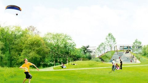 « L'objectif est de faire de ce parc naturel un lieu de rassemblement culturel et populaire qui viendra s'appuyer sur les initiatives déjà en place sur le site », selon l'agence Base. Ici une perspective d'une future aire de jeux. PHOTO : BASE