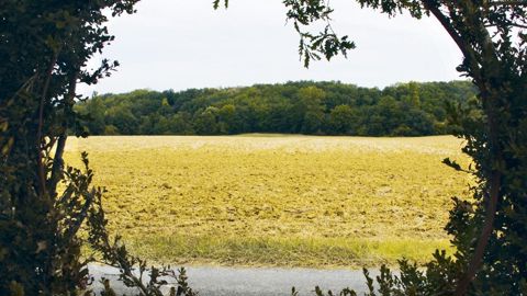Plusieurs ouvertures comme celle-ci ont été réalisées dans la haie bocagère. Elles offrent ainsi une vue sur le paysage environnant le domaine de Mestre Gouny.