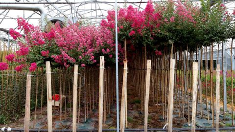 « Notre grande spécificité, c'est la haute tige », précise Christian Gaurrat. Un produit compliqué à former, car Lagerstroemia indica a du mal à arrêter sa croissance en automne, surtout lorsque les températures sont douces. Un gel subit en octobre et les plantes encore en sève gèlent. Le pépiniériste et son associé s'affranchissent de cette difficulté en cultivant sous serre les tiges en pleine terre. Les variétés sont greffées sur porte-greffe de Lagerstroemia indica 'Rosea' pour obtenir une hauteur de tige suffisante en trois ans. « La floraison du lilas des Indes se situe au bout de la pousse, et s'accompagne de l'arrêt de la croissance du rameau, explique Christian Gaurrat. Comme nos variétés fleurissent tôt en saison, elles se développent moins vite. Le greffage permet en outre d'éviter les coudes de croissance. » L'apex est taillé dans les deux mois qui suivent et le bouquet formé. La culture, gourmande en eau et en température, se déroule correctement dans les terres noires et fraîches du Sud-Ouest, en protection biologique intégrée et fertirrigation par goutte-à-goutte.