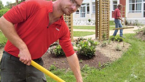 Anthony Gadois est jardinier-paysagiste et Compagnon du Tour de France. À Savigny-le-Temple, il est chargé d'installer une nouveauté dans le jardin de l'UHR : « Les résidents ont une image dégradée d'eux-mêmes. Nous avons construit une pyramide en verre avec des miroirs qui forment un jeu de prismes. On reflète le paysage et les personnes, mais pas en frontal. Un carillon et une arche en osier doivent encore être installés », soulignet-il, fier de travailler avec une entreprise « de référence ». Cette création est issue de discussions qui ont été menées avec les médecins et d'autres soignants. Le jardin est organisé pour circuler facilement : la déambulation étant un aspect important. Dans les trois espaces verts de l'EHPAD, plusieurs types de jardinières se côtoient : un modèle circulaire permettant l'accès en fauteuil roulant (une réalisation maison), des contenants où la terre est surélevée pour faciliter l'accès et des petits potagers en pleine terre. Le jeune paysagiste en formation aime beaucoup l'aspect humain de ce travail : « Les résidents viennent nous voir. Et contrairement aux réalisations pour des particuliers, ce jardin n'est pas un objet comme une nouvelle voiture. Il a une fonction réelle pour les patients. »