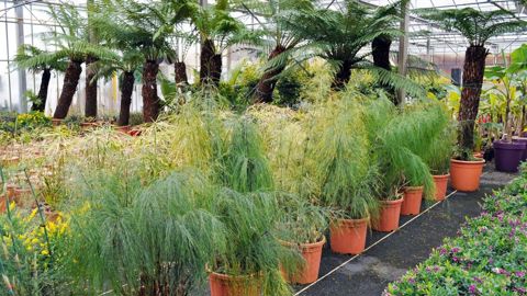 Toujours « tendance », destinées aux zones humides, au premier plan, des Elegias capensis (prêles) cultivées avec des papyrus et les Dicksonia antarctica, grande spécialité des pépinières. PHOTO : I. CORDIER