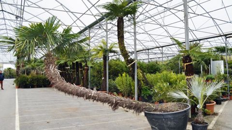 Dans la serre de stockage, un Trachycarpus fortuneii cultivé couché pour répondre aux besoins des paysagistes devant une Dicksonia antarctica. PHOTO : I. CORDIER