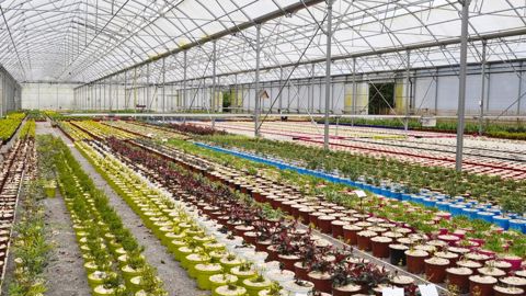 Les plantes saisonnières, gauras, agapanthes, sauges, lavandes et autres espèces, sont produites par séries dans les serres équipées de tapis roulants avec rempoteuses extérieures. PHOTO : I. CORDIER