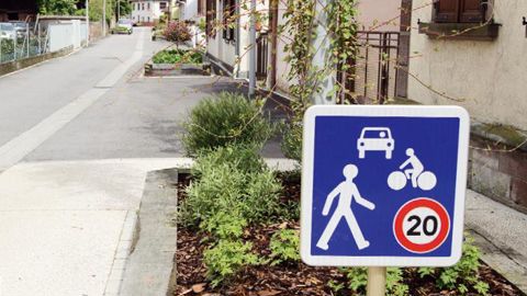La zone limitée à 20 km/h est matérialisée par des portes végétales.