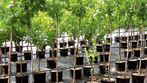 Ainsi, en 2010-2011, les fruitiers ont reçu une fumure de fond mixte mi-minérale à libération programmée 9 mois (4 kg/m3), mi-organique naturelle (3 kg/m3, voir l'encadré). « Pour ne pas prendre de risques en fin de culture, nous avons décidé cette année encore de compléter cette fertilisation par un surfaçage, en juillet, avec un engrais organique. Avec ce type d'engrais, il est nécessaire d'anticiper les besoins de la plante car il faut tenir compte du délai de solubilisation des éléments fertilisants. À l'avenir, avec plus de recul, nous espérons pouvoir supprimer cet apport estival si les résultats obtenus cette année se confirment. Nous observons, en effet, des pousses de plus d'un mètre vingt sur les cerisiers par exemple », poursuit le chef d'entreprise. Autre aspect en défaveur du surfaçage, la pépinière a adopté les collerettes coco sur l'ensemble de ses conteneurs pour éviter les herbicides chimiques et cette collerette gène quelque peu l'épandage et la dissolution de l'engrais.