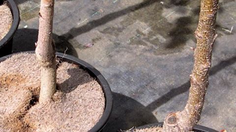 Les pépinières Roux produisent chaque année plus de 15 000 arbres fruitiers formés et cultivés en conteneur pour le marché de la jardinerie, le libre service agricole et la vente au détail au sein de l'entreprise. Jusqu'en 2008, les arbres étaient empotés dans un substrat à base d'écorce et de tourbe, fabriqué localement (Ardèche), auquel le fournisseur incorporait un engrais à libération programmée. Cette fertilisation était complétée en cours de culture par un engrais soluble en ferti-irrigation et, si besoin, par un surfaçage en cours d'été (voir l'encadré). Si cette méthode de culture donnait entière satisfaction au pépiniériste au niveau de la croissance des plantes, elle présentait toutefois quelques points négatifs d'un point de vue environnemental et commercial. « Ce substrat très drainant obligeait à un suivi régulier de l'arrosage », précise Rémi Bret, qui a rejoint son père, Bernard, à la direction de l'entreprise en 2005. « Si cela ne posait pas de problème en pépinière, ce suivi était plus difficile sur les points de vente. Nos clients nous ont demandé de tester d'autres substrats avec une meilleure rétention en eau. » D'autre part, la fertilisation soluble en arrosage provoque la perte de nombreux éléments fertilisants, notamment sur les aires arrosées par aspersion, mais aussi en arrosage localisé, par lessivage, du fait de la porosité du substrat.