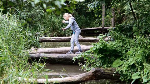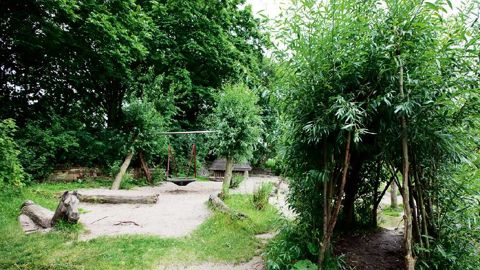 Les Hollandais sont très proches d'une nature omniprésente dans l'ensemble du pays. Cette sensibilité particulière, loin d'être aussi généralisée en France, les anime. Peut-être est-ce la pratique du vélo toute l'année et par tous les temps (froid, pluie, chaleur et vent) qui les prédispose à cette approche écologique et respectueuse. « À Rotterdam, nous avons mis en place une aire de jeux naturelle, de Speeldernis, qui est une école de la nature à l'échelle des enfants. C'est presque une approche philosophique : la ville offre aux tout-jeunes la possibilité de s'ébattre librement dans une nature presque authentique et laisse libre cours à leur imagination féconde. Tomber, se griffer... fait également partie du jeu comme lors de l'apprentissage de la marche, et permet de trouver la juste mesure », explique Annemieke Fontein, directrice du service des espaces verts de Rotterdam, aux Pays-Bas. Dans cet espace clos, on peut tout faire, ou presque, comme des robinsons. Sous les balançoires, le sol n'est pas recouvert de revêtement amortissant, comme le recommandent les prescriptions d'homologation des aires de jeux en France, mais de terre standard. Dans la partie réservée aux plus petits, les structures sont en matériaux bruts comme des troncs d'arbres. Un mince filet d'eau sur lit de sable serpente pour mouiller ses bottes, ses pieds ou son maillot l'été. Dans la partie des plus grands, séparée de celle des plus petits (jusqu'à 4 ans), les branches d'arbres ne sont pas évacuées mais, au contraire, laissées à la disposition des enfants qui s'amusent à les transporter et à construire des cabanes et des tipis où bon leur semble. Ces branches, préparées par le personnel du parc, donnent toutefois une impression de naturel. Les feuilles, les fougères, les lianes servent de murs ou de tapis dans les cabanes. On court partout sur les pontons, dans les allées, entre les arbres dans les sous-bois. Les fonds de culotte sont râpés sur des toboggans en terre qui recouvrent les pentes de la « montagne ». Cette dernière est parcourue d'un réseau invisible de buses de canalisation en béton de fort diamètre (80 cm), dans lesquelles les enfants peuvent circuler courbés et imaginer qu'ils sont des taupes ou qu'ils se trouvent dans un souterrain. La fontaine, approvisionnée par l'eau de la ville et construite comme une cascade avec des roches non arrondies, alimente tout d'abord un ruisseau que les enfants empruntent pour se rafraîchir, puis les grandes mares où ils ont pied. Des troncs d'arbres enjambent les plus petites retenues d'eau et les têtes blondes doivent user de leur équilibre pour traverser. Des canards y nagent en famille, lorsque les mares ne sont pas le territoire des plus jeunes.