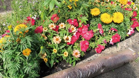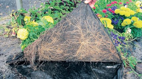 Des boudins d'écorce (ici, sur le côté du tapis) disposés entre les tapis d'annuelles évitent l'écrasement des plantes. PHOTO : VALÉRIE VIDRIL