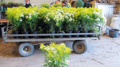 L'autre piste développée par les pépinières Huchet pour trouver de nouveaux axes de développement est la jardinerie. Une démarche entamée il y a trois ans et qui commence à porter ses fruits. « Nous nous sommes tournés vers différentes enseignes, mais nous allons surtout vers les indépendants », précise Gilles Colinet. Pour répondre aux attentes spécifiques de ce secteur d'activité, des pots de couleur brillants ont fait leur apparition dans les cultures, sur une gamme limitée mais avec des lots importants. « C'est dur de trouver les plantes les mieux adaptées, estime le chef d'entreprise, mais nous vendons bien les bambous, surtout les Fargesia, les Phormium, Choisya et Pittosporum, des produits sur lesquels il y a peu de concurrence. » Outre le pot de couleur, les plantes sont mieux formées, plus ramifiées et peuvent être vendues en fleurs. Les livraisons se font à partir d'une flotte de camions en propre pour le régional, partout où il est possible de faire l'aller-retour dans la journée. Cherbourg (50) est la limite au nord, Brest (29) à l'ouest, la grande limite... Si la livraison dépasse les capacités de l'aller-retour quotidien, les box ou rolls sont livrés par transporteur. Aujourd'hui, rien que la préparation des commandes pour les jardineries représente un poste de travail à plein-temps.