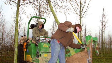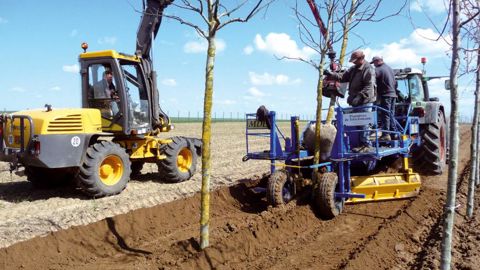 « L'activité agricole permet de rentabiliser une partie du matériel », explique Teun De Jong. L'activité en production de ligneux diminue en effet d'avril à octobre ; durant cette période, la ferme prend le relais, faisant usage des huit tracteurs de 50 à 280 CV que la pépinière utilise plutôt en hiver. Sur ses 350 ha d'exploitation, le producteur cultive avec deux salariés 285 ha de betteraves, céréales, lin... Il réalise le suivi avec un technicien de la coopérative agricole Calipso-Picardie, pour laquelle travaillait déjà l'ancien propriétaire. « Le travail en grandes cultures me passionne et ça me change de celui de la pépinière. » Soixante-cinq hectares sont consacrés aux arbres de pleine terre. L'activité a nécessité néanmoins d'investir dans des engins spécifiques : une arracheuse Holmac (lames de 40 à 140 cm de diamètre) ; deux arracheuses Optimal de 110 cm et 140 cm pour les plus gros sujets ; deux grues Mecalac pour le chargement des mottes grillagées ; dix remorques conçues pour le transport des mottes grillagées ; un chargeur télescopique JCB 4 t ; une planteuse Damcon PL-40 pour la transplantation d'arbres de 1,75 m jusqu'aux 16/18 racines nues ; une planteuse Damcon PL-85 pour la transplantation d'arbres jusqu'aux 70/80 mottes grillagées ; et trois plates-formes pour la taille.