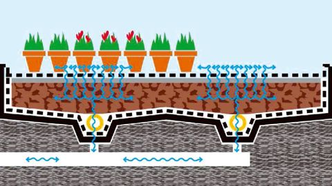 (*) Drainage vertical avec la percolation de l'eau de drainage vers le bas dans la couche de pouzzolane, par opposition au drainage horizontal avec écoulement de l'eau sur les surfaces bétonnées, goudronnées ou recouvertes de toiles étanches. Voir « Récupérer, stocker, recycler l'eau : ça coule de source » dans le Lien horticole n° 760, du 6 juillet 2011, page 12.