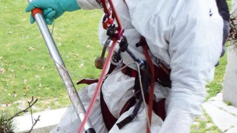 L'échenillage, en période hivernale, permet d'éliminer les nids facilement accessibles. Les arboristes grimpeurs chargés de ce travail doivent être équipés d'une protection complète. PHOTO : VILLE DE LYON