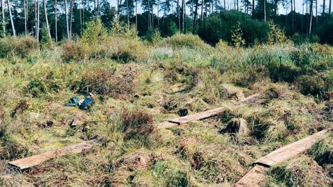 Tourbière de la mare moussue. Les planches permettent de limiter le piétinement pendant les travaux. PHOTO : DERVENN