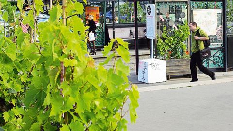 À la station de tramway et de bus Duchesse Anne, un verger de pêchers, pruniers, cerisiers, abricotiers, figuiers... a envahi le coteau, et des vignes, le mobilier urbain. PHOTO : VILLE DE NANTES