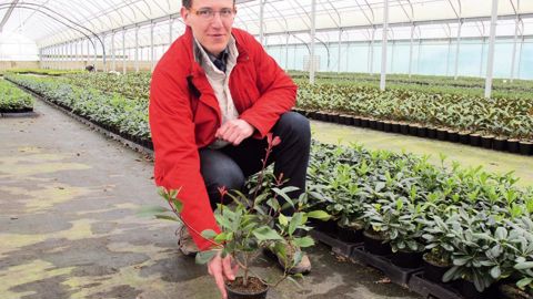 François Carré, technico-commercial aux pépinières La Forêt, présente un Photinia 'Red Robin' en pot de 14 cm : le préconteneur constitue « une évolution “produit” à la suite d'une demande du marché ». PHOTO : VALÉRIE VIDRIL