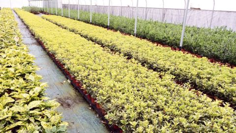 La pépinière propose actuellement 220 variétés en préconteneur, avec pour objectif 250 à 300 à terme. Ici : Aucuba, Osmanthus 'Tricolor' et Sarcococca en pot de 14 cm. PHOTO : PÉPINIÈRES LA FORÊT