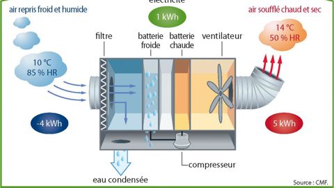 La Microdésu est une petite pompe à chaleur air/air monobloc à déshumidification. Elle assèche l'air de l'abri par condensation de l'humidité ambiante sur sa batterie froide (voir schéma). En outre, elle récupère l'énergie de condensation de la vapeur d'eau pour la restituer à l'air déshumidifié : l'air soufflé par la machine est chaud et sec. La Microdésu offre ainsi une efficacité thermodynamique intéressante : 1 kW électrique fourni au compresseur restitue 5 kW de chaleur dans la serre, selon le concepteur et distributeur CMF Serres florentaises. La puissance électrique totale (Pac + ventilateur) est de 3,4 kW. « Plus il fait chaud et humide, plus la Pac pompe de l'eau ; s'il fait frais, la machine est moins efficace », explique Alain Brichet. Selon la fiche technique du concepteur, l'appareil évacue 6,6 litres d'eau/heure pour un air ambiant à 20 °C et 85 % d'humidité relative (HR) ; cette quantité passe à 3,2 l/h à 10 °C et 85 % d'HR. Côté maintenance, le producteur a juste à changer ou laver le filtre, régulièrement colmaté par les particules de terreau. Mais Alain Brichet ne s'en fait pas pour l'entretien : le fabricant sous-traitant ETT (Énergie transfert thermique) n'est pas très loin (Ploudalmézeau) !