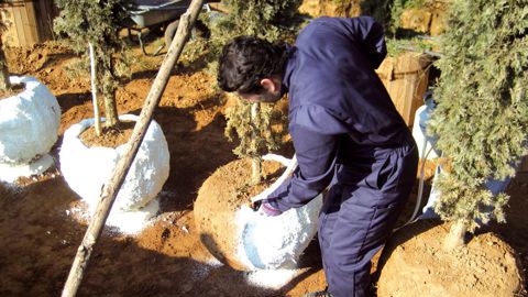 Cinq minutes après application, la mousse a séché et durci. Elle forme une sorte de coque. « À l'air et aux UV, la structure du produit (polyuréthane à cellules fermées) forme une pellicule extérieure solide qui ne bouge pas malgré les arrosages. Elle est assez dure pour tenir au transport », explique Gonzague Six, représentant international pour cette technique. « La coque peut être cassée facilement pour planter une motte nue. On peut aussi planter avec la coque. En terre, les observations montrent un passage aisé des racines au travers de la coque qui perd ses propriétés mécaniques, particulièrement dans le sol. Elle se désagrège en petits morceaux par étapes. » Sinon, on peut la fracturer (simplement à coups de pelle) pour l'ajourer et optimiser le passage des racines. À la tête d'une entreprise de terrassement, à Saint- Antonin-du-Var (83), Jean-Luc Gil plante de gros sujets chez les particuliers. « Avec cette technique, j'ai de très bons résultats, surtout pour les gros cyprès à la reprise délicate, notamment quand il y a du vent. Je plante avec la coque en mousse. Même si la motte bouge un peu au vent, les racines supportent bien. Je n'ai perdu aucun client », constate-t-il. « Posées au sol, les plantes peuvent rester longtemps en attente dans leur coque. J'ai en essai un grand laurier sauce qui tient très bien depuis six ans ! », ajoute Jean-Marie Siam. Au fil du temps, la coque exposée au soleil prend naturellement une patine jaune. « Elle supporterait des peintures. On peut aussi lui donner des formes en jouant sur l'épaisseur... un aspect décoratif susceptible d'intéresser les points de vente. »