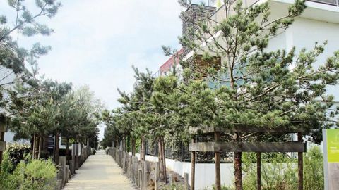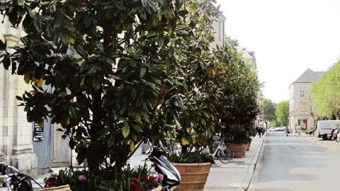 Ces grands pots plantés d'arbres permettent de végétaliser la rue, et de mettre en valeur le bâti en incorporant des éléments à l'échelle du paysage.