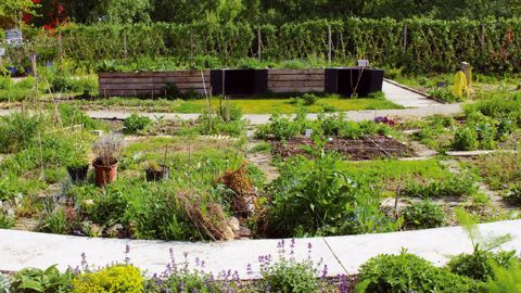 Les nouvelles parcelles potagères en pleine terre sont gérées par l'association de jardins partagés Les Petits Pois de la Villette. Au second plan, des parcelles en hauteur spécialement aménagées pour les personnes en fauteuil roulant.
