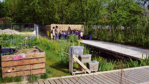 La zone humide recueille les eaux de ruissellement du jardin et permet de se familiariser avec les plantes spécifiques de ce milieu.