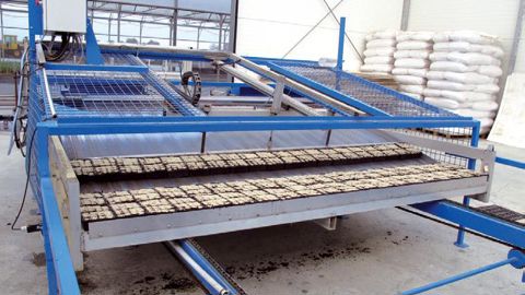 Franck Picoulier, responsable des semis, peut manipuler seul des racks de 140 barquettes de 10 plants en motte, fabriqués sur mesure par Vermako.En médaillon : la chaîne de semis a été adaptée sur mesure pour transférer automatiquement les barquettes sur les racks.