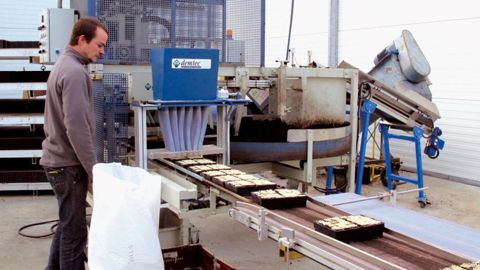 Franck Picoulier surveille la chaîne de semis mécanisé en motte. Des moules différents sont utilisés selon les espèces et les cultures (fleurs, légumes...).